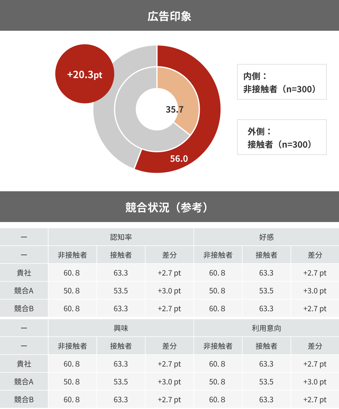 「番組聴取者」と「非聴取者」にアンケート調査し、貴社ブランドや商品に対する態度変容を検証します。