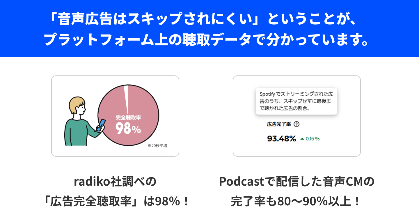 リスナーがスキップしようと思わない=広告も最後まで再生されやすい傾向にあります。